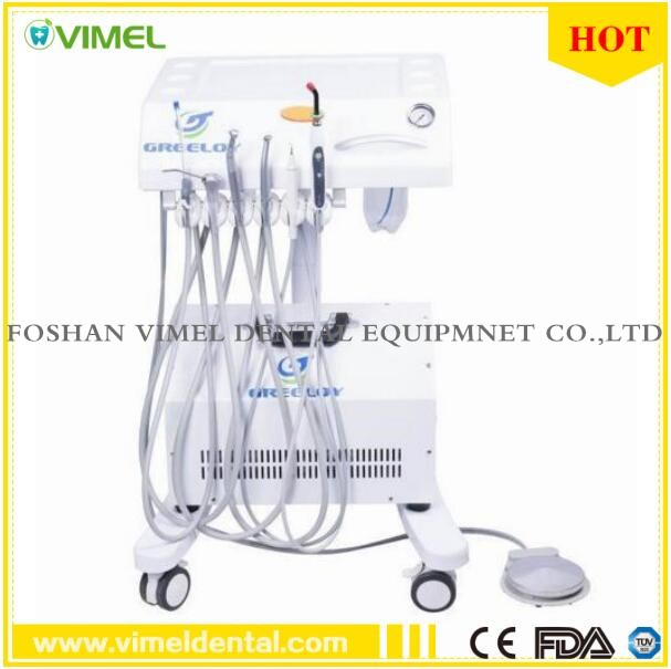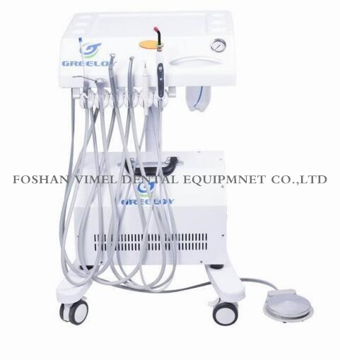 Brand: Greeloy Model: GU-P302 + GU-P300Product description:Mobile Dental Unit GU-P302, it's main applications are for oral heath and treatment. It is a indoor operation unit, mobile design, novel appearance, and easy operation. Professional medical casters with brake, very silent to move, reveal the high-end quality. Light weight, freely to remove. Can with a external air supply system.Specification: Gross Weight: 45kg Product Size: 65x60x85cm (LxWxH) Standard Accessories: Saliva Ejector 1pc High and Low speed Handpiece Tubing 1pc each 3-Way Syringe 1pc LED Curing Light 1pc Ultrasonic Scaler 1pc Clean Water Supply System 1set Drainage System 1set Foot Control 2pcs Air Compressor 1Pc Contact us